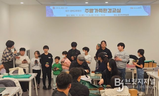 브릿지저널 김진석 기자 | 대구시교육청은 11월 22일과 29일 양일간 대구녹색학습원에서 경북 지역 40가족을 대상으로 ‘가족주말환경교실’을 운영한다. 이번 프로그램은 2025년 대구-경북교육청 교류 증진 사업의 하나로, 학생 60명과 학부모 80명이 참여해 환경 체험 활동을 진행한다.