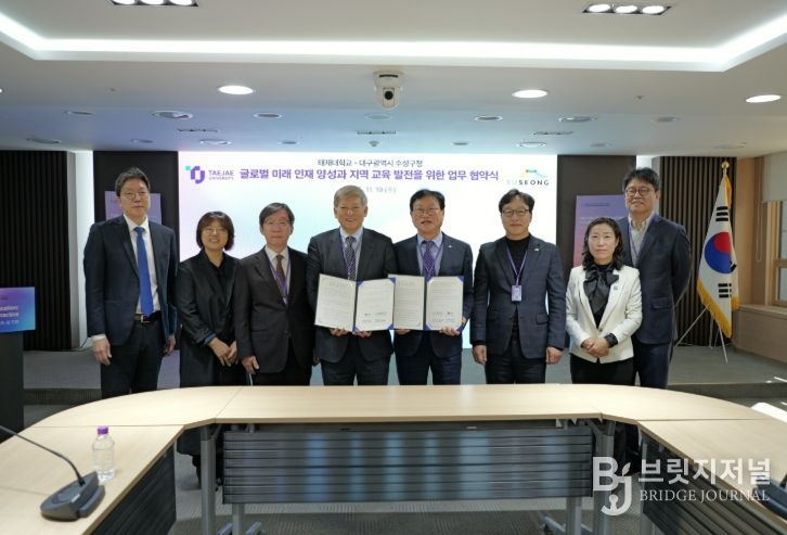 브릿지저널 김진석 기자 | 대구 수성구는 지난 19일 태재대학교(총장 염재호)와 글로벌 미래 인재 양성 및 지역 교육 발전을 위한 업무 협약(MOU)을 체결하고 상호 협력 체계를 구축했다고 밝혔다.