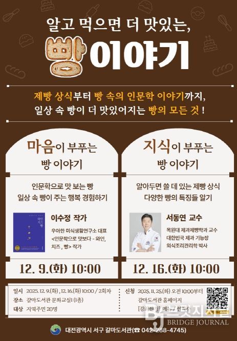 브릿지저널 정보영 기자 | 대전 서구 갈마도서관은 ‘알고 먹으면 더 맛있는 빵 이야기’ 강좌를 운영한다고 24일 전했다.
