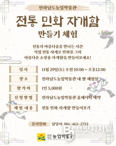 브릿지저널 김경미 기자 | 전라남도농업박물관이 점차 사라지는 전통문화의 의미를 되새기기 위해 오는 29일 오전 10시부터 2시간 동안 박물관 쌀 체험실에서 ‘전통 민화 자개함 만들기 체험’ 행사를 펼친다.