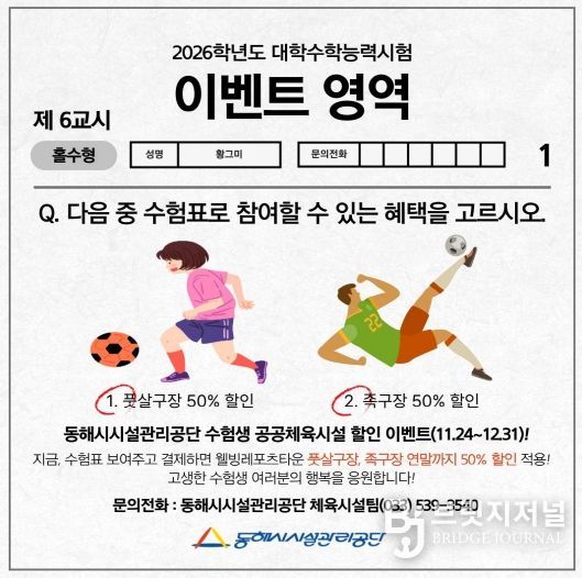 브릿지저널 윤나영 기자 | 동해시시설관리공단은 2026학년도 대학수학능력시험을 마친 지역 수험생들의 심리적 피로 회복과 건전한 여가활동을 지원하기 위해 공단이 운영하는 공공 체육시설을 활용한 수험생 특별 할인 이벤트와 수영강습 프로그램을 마련했다고 밝혔다.