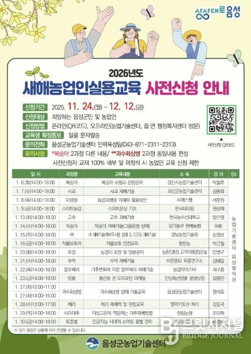 브릿지저널 김경미 기자 | 음성군농업기술센터는 ‘2026년 음성군 새해농업인실용교육’을 내달 12일까지 사전 신청받는다고 밝혔다.