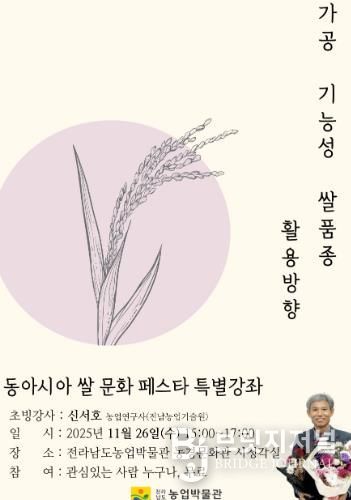브릿지저널 김경미 기자 | 전라남도농업박물관은 26일 오후 3시 ‘동아시아 쌀 문화 페스타’ 다섯 번째 특별강좌를 열어 국내 대표 쌀 품종 개발 전문가를 초청해 미래 쌀 산업의 혁신 모델을 제시한다고 밝혔다.