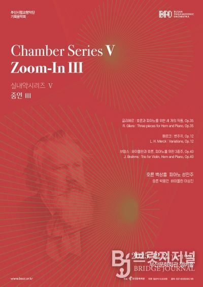 '줌인' 시리즈는 한 명의 단원에 집중해 가까이서 호흡하고 음악으로 교감하는 기획 시리즈로, 2022년 12월 첫 공연을 올린 뒤 다양한 악기의 독주곡들로 관객들과 밀접하게 소통하며 많은 사랑을 받고 있다. 이번 무대에선 부산시립교향악단의 호른 부수석 백상흥과 피아니스트 성민주, 호르니스트 박용인과 바이올리니스트 이상진의 빛나는 호흡으로 아름다운 무대를 선사할 예정이다.