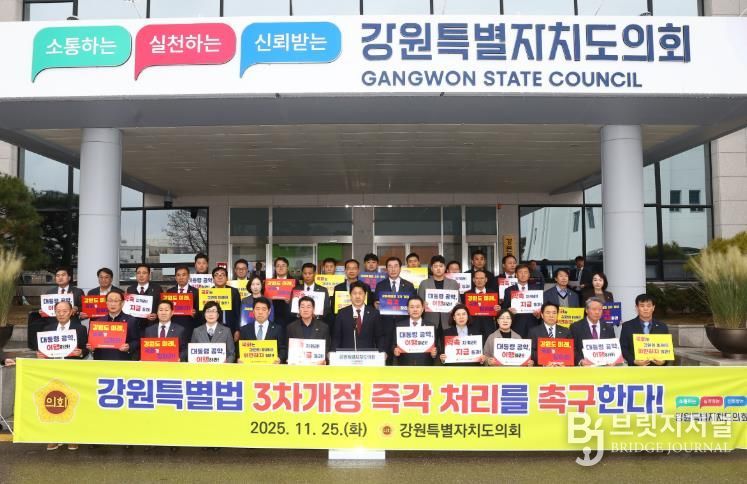 브릿지저널 윤나영 기자 | 강원특별자치도의회는 25일 오후 1시 30분 도의회 본관 앞에서 ‘강원특별법 3차 개정안’의 조속한 국회 심사를 촉구하는 결의대회를 열었다.