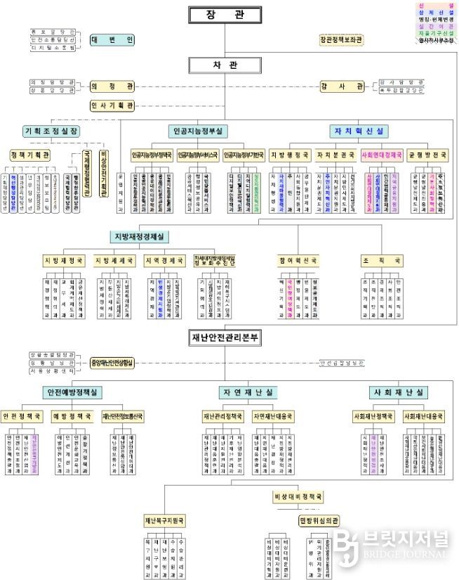 브릿지저널 김경미 기자 | 행정안전부는 인공지능(AI), 지방정부 및 국민안전 정책 수준을 한단계 더 높이고, 국정과제 추진동력을 강화하기 위한 조직개편을 실시했다고 밝혔다.