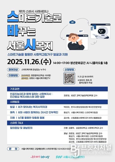 브릿지저널 김경미 기자 | 서울시복지재단 고립예방센터는 11월 26일 오후 2시, 서울 마포구 청년문화공간JU 5층 니콜라오홀에서 '2025 제1차 스마트기술로 바꾸는 서울시복지 세미나'를 개최한다고 밝혔다.