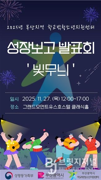 브릿지저널 윤나영 기자 | 부산시는 27일 낮 12시 남구 그랜드모먼트 유스호스텔에서 '2025년 부산지역 꿈드림 성장보고 발표회 '빛무늬''가 열린다고 밝혔다.