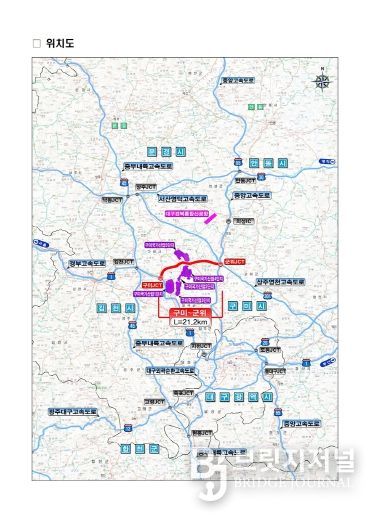 구미~군위 고속도로는 구미에서 군위군 효령면(중앙고속도로)까지 총 21.2km 구간을 4차로로 신설하는 사업으로, 사업비는 약 1조 5,627억 원 규모다. 이는 1970년 경부고속도로 이후 55년 만에 구미를 통과하여 동서를 잇는 첫 고속도로라는 점에서 의미가 크다.