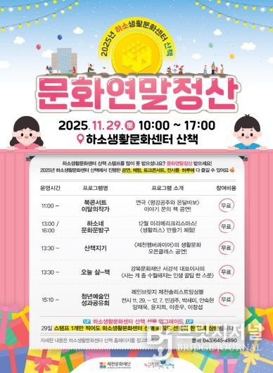 브릿지저널 김경미 기자 | 제천문화재단(이사장 김상수)은 오는 29일 하소생활문화센터 산책에서 한 해 동안 시민과 함께 걸어온 다양한 프로그램을 한자리에서 만나는 '문화연말정산'을 운영한다고 밝혔다.