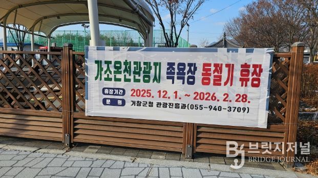 브릿지저널 정보영 기자 | 거창군은 오는 12월 1일부터 내년 2월 말까지 가조온천관광지 입구(가조면 일부리 1263)에 있는 족욕체험장을 동절기 휴장한다고 밝혔다.