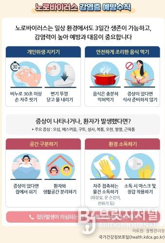 브릿지저널 김경미 기자 | 충북보건환경연구원은 노로바이러스에 의한 식중독이 주로 겨울철에 집중적으로 발생하는 만큼 도민들의 각별한 주의를 당부했다. 또한, 노로바이러스는 낮은 기온에서 활성이 높아지는 특성이 있어 위생 관리에 소홀할 경우 집단 감염으로 이어질 가능성이 높다고 강조했다.