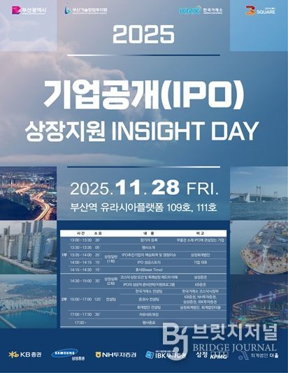 브릿지저널 윤나영 기자 | 부산시와 부산기술창업투자원은 한국거래소와 함께 28일 오후 1시 부산역 유라시아플랫폼에서 지역에서 처음으로 '2025년 기업공개(IPO, Initial Public Offering) 상장 지원 인사이트 데이(INSIGHT DAY)'를 개최한다고 밝혔다.
