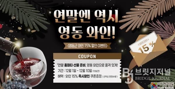 또한 10일까지는 영동군 대표 특산품인 와인 전 품목을 15% 할인하는 ‘연말 감사 이벤트’도 진행된다. 군은 이번 할인 행사를 통해 연말 홈파티용 와인, 선물용 와인, 연말 모임 답례품 등으로 활용하기 좋은 영동 와인의 매력을 널리 알릴 계획이다.