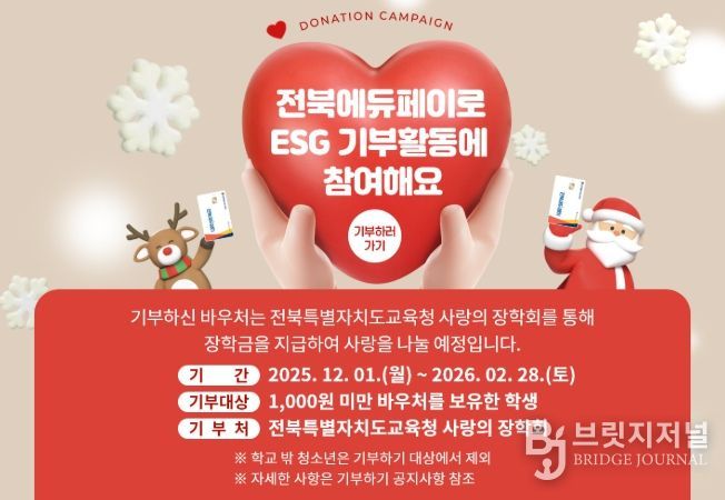 브릿지저널 윤나영 기자 | 전북특별자치도교육청은 학생들의 ESG 기부 활동을 장려하고, 지속가능한 사회 발전에 동참할 수 있도록 ‘전북에듀페이 기부 참여 기간’을 운영한다고 1일 밝혔다.