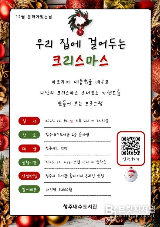 브릿지저널 김경미 기자 | 청주내수도서관은 12월 문화가 있는 날을 맞아 크리스마스 오너먼트 가랜드를 제작하는 체험 프로그램을 운영한다.