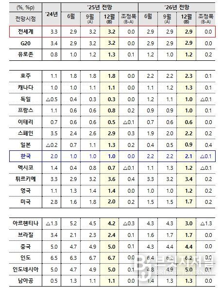 향후 세계경제 성장률은 ’25년 3.2%, ’26년 2.9%, ’27년 3.1% 수준으로 전망된다. 지역별로 살펴보면, 미국은 고용 부진과 관세 인상에 따른 물가 전가 등의 영향으로 ’26년 성장세가 둔화(’25년2.0→’26년1.7→’27년1.9%)될 전망이다. 일본은 금년 내수를 바탕으로 견조한 성장을 기록하겠으나 순수출이 하방요인으로 작용하며 성장세가 둔화(’25년1.3→’26년0.9→’27년0.9%)될 것으로 예상된다. 유로 지역은 ’26년 소폭 둔화된 이후 내수 회복과 무역 반등에 힘입어 ’27년 회복(’25년1.3→’26년1.2→’27년1.4%)할 전망이다. 중국의 경우 부동산 부문의 지속 부진과 조기선적 효과 소멸 등의 영향으로 성장세가 둔화(’25년5.0→’26년4.4→’27년4.3%)될 전망이다.
