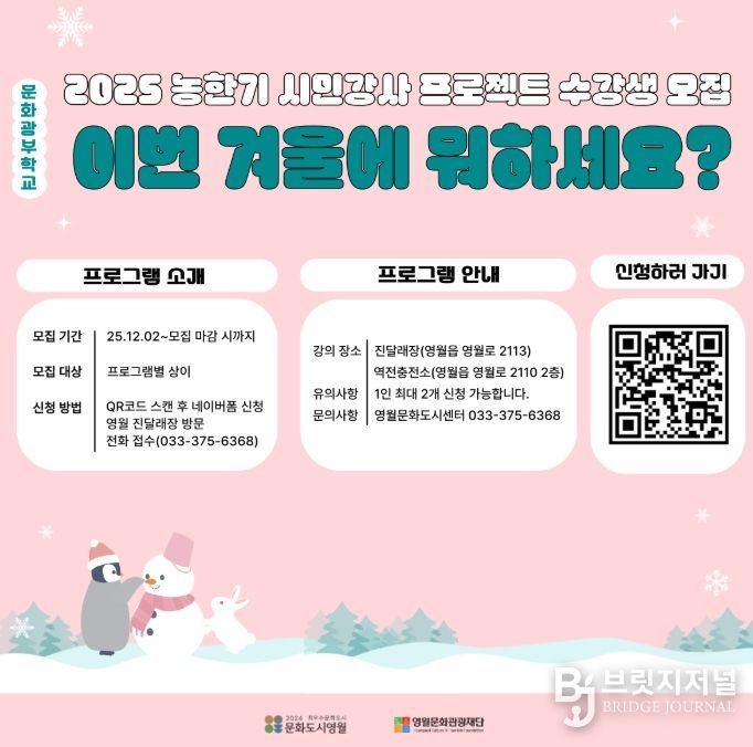 브릿지저널 윤나영 기자 | (재)영월문화관광재단은 2025 문화 광부학교 농한기 시민 강사 프로젝트 수강생을 12월 2일부터 모집한다고 밝혔다.