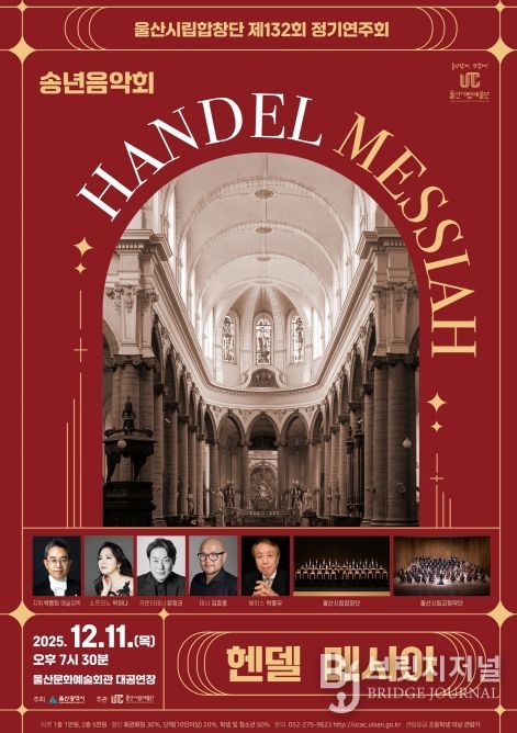 브릿지저널 윤나영 기자 | 울산시립합창단이 오는 12월 11일 오후 7시 30분 울산문화예술회관 대공연장에서 제132회 정기연주회로 송년 음악회 헨델(G.F Handel) ‘메시아(Messiah)’를 선보인다.