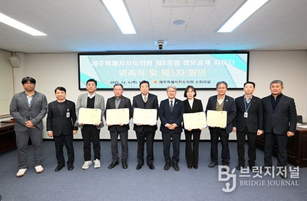 브릿지저널 정보영 기자 | 제주특별자치도의회는 12월 4일 오후 2시 30분, 도의회 의사당 소회의실에서 '제주 제2공항 건설사업 정보공개 자문단' 위촉식을 개최하고 제1차 회의를 진행했다. 자문단은 제2공항 건설사업과 관련된 정보를 종합·정리하고, 도민에게 보다 정확하고 쉽게 전달될 수 있도록 조언하는 역할을 맡는다.