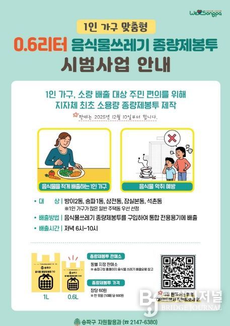 브릿지저널 김경미 기자 | 서울 송파구가 전국 지방자치단체 최초로 1인 가구에 최적화된 0.6ℓ 규격의 음식물쓰레기 종량제봉투를 오는 10일부터 시범 도입해 운영한다고 알렸다.