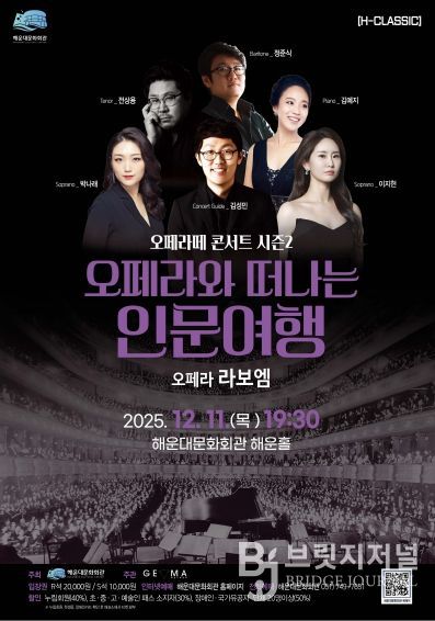 브릿지저널 윤나영 기자 | 해운대문화회관(관장 이서윤)은 오는 12월 11일 오후 7시 30분, 오페라떼 콘서트 시즌2‘오페라와 떠나는 인문 여행 ’라보엠’을 해운대문화회관 해운홀에서 개최한다.