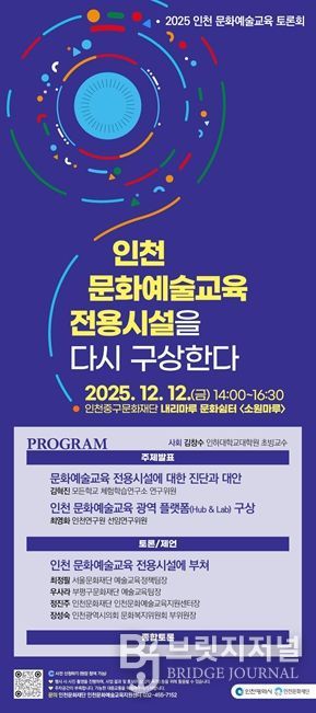 브릿지저널 김경미 기자 | (재)인천문화재단은 오는 12월 12일 14시, 인천중구문화재단 내리마루 문화쉼터에서 '2025 인천 문화예술교육 토론회' “인천 문화예술교육 전용시설을 다시 구상한다”를 개최한다.