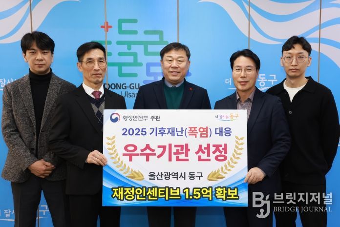 브릿지저널 윤나영 기자 | 울산 동구는 행정안전부 주관 2025 기후 재난(폭염) 대응 평가에서 ‘우수 지자체’로 선정되어, 기관 표창과 함께 1억 5천만 원의 재정 인센티브를 받게 됐다.