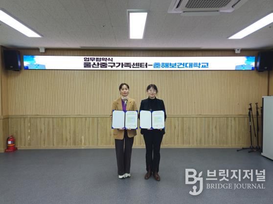 브릿지저널 윤나영 기자 | 울산중구가족센터와 춘해보건대학교 글로벌케어과가 12월 10일 오후 2시 울산중구가족센터 다목적실에서‘산학 공동발전 지역 멘토기관’ 업무협약을 체결했다.