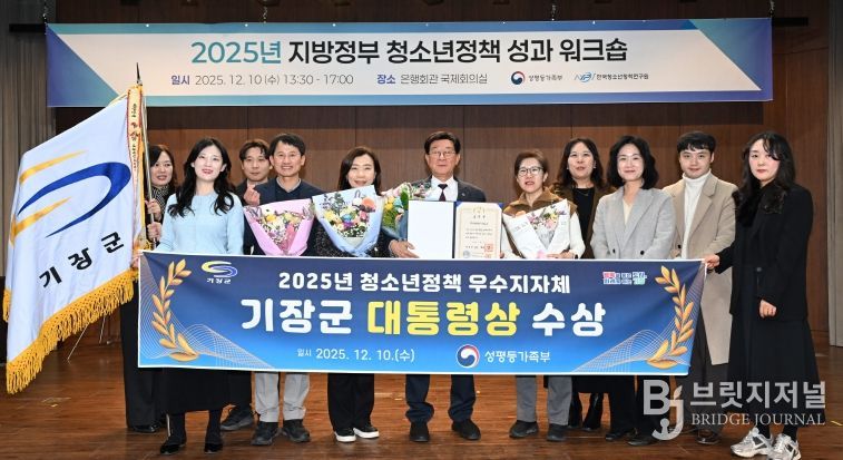 브릿지저널 윤나영 기자 | 기장군은 10일 서울 중구 은행회관에서 열린 성평등가족부 주관‘2025년 청소년정책 우수지자체 정부포상’에서 우수 지자체로 선정돼 ‘대통령 표창’을 수상했다고 밝혔다.