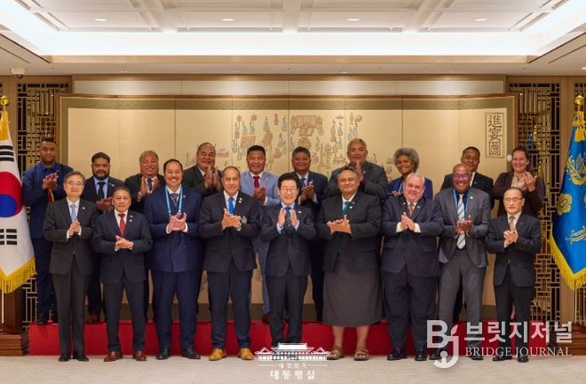 브릿지저널 김경미 기자 | 이재명 대통령은 12월 10일 오전, 대통령실에서 제6차 한-태평양도서국 외교장관회의 참석을 위해 방한한 태평양도서국 외교장관 일행을 접견했다.