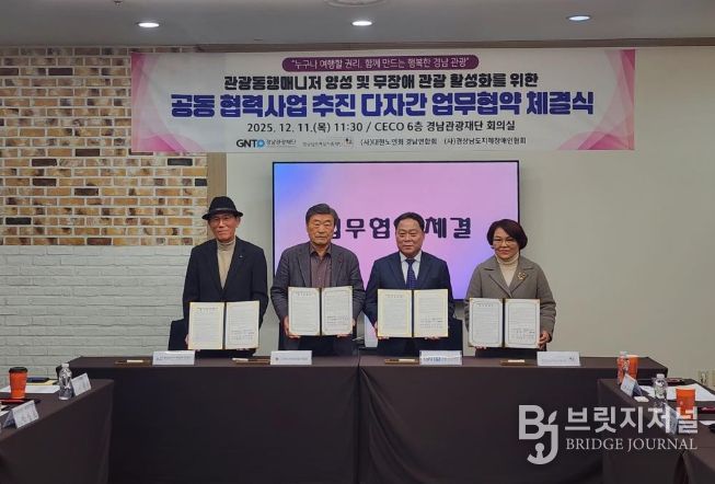브릿지저널 김경미 기자 | 경상남도관광재단은 11일 오전 12시 창원컨벤션센터에서 경상남도가족센터, 대한노인회 경남연합회, 경상남도지체장애인협회와 무장애 관광 활성화를 위한 다자간 업무협약을 체결했다고 밝혔다.