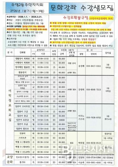브릿지저널 김경미 기자 | 고양특례시 일산서구 주엽2동 주민자치센터는 12월 15일부터 19일까지 2026년 1분기 문화강좌 수강생을 모집한다고 밝혔다.