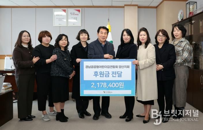 브릿지저널 김경미 기자 | 양산시공공형어린이집은 15일 양산시를 방문해 24명의 회원들의 마음을 담은 후원금 2,178,400원을 시나브로복지관 ‘발달지연 조기발견 아이보듬사업’에 전달했다.