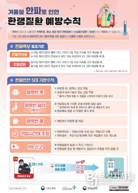 특히 실외 근로자, 야간작업 근로자, 고령자 등 취약 근로자 중심으로 한파 예방조치가 충분히 이행되고 있는지 집중 점검하며, 갑작스러운 체온 저하로 인한 저체온증, 동상 등 건강 피해를 예방하기 위해 따뜻한 복장 착용, 충분한 휴식, 온열기기 안전 사용 수칙 준수 등 예방수칙을 함께 안내하고 있다.