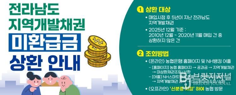 브릿지저널 김경미 기자 | 전라남도가 오는 31일까지 보름여간 2025년 전남도 지역개발채권 미환급금 일제상환 기간을 운영, 도민 권리 보호에 나선다고 밝혔다.