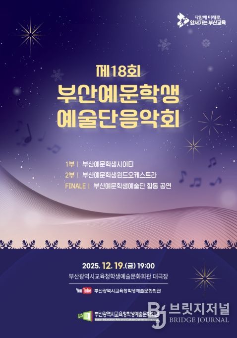 브릿지저널 윤나영 기자 | 부산광역시교육청 학생예술문화회관은 19일 오후 7시 회관 대극장에서 ‘제18회 부산예문학생예술단음악회’를 개최한다.