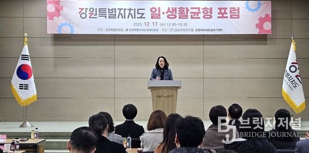 브릿지저널 윤나영 기자 | 강원특별자치도는 12월 17일 강원특별자치도와 강원특별자치도경제진흥원이 공동 주최하고, 강원특별자치도여성가족연구원과 강원여성새로일하기센터가 주관하여 강원특별자치도여성가족연구원 1층 강당에서 '강원특별자치도 일·생활균형 포럼'을 개최했다.
