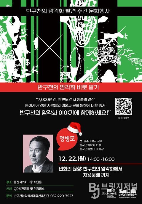 브릿지저널 윤나영 기자 | 울산암각화박물관은 오는 12월 22일 오후 2시 울산시의회 1층 시민홀에서 ‘명사특강: 반구천의 암각화 바로 알기’ 두 번째 강연을 개최한다고 밝혔다.
