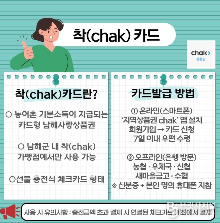 브릿지저널 김경미 기자 | 남해군은 농어촌 기본소득 시범사업의 본격적인 시행에 앞서, 지급 수단인 카드형*(chak) 지역사랑상품권의 사전 발급이 필요하다고 밝혔다.