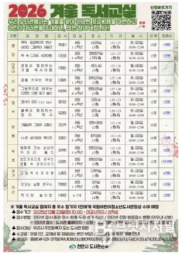 브릿지저널 정보영 기자 | 천안시는 내년 1월 12~ 30일 어린이와 함께하는 ‘겨울 독서교실’을 운영한다고 19일 밝혔다.
