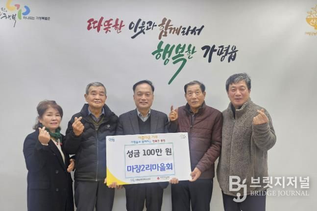 브릿지저널 김경미 기자 | 가평군 가평읍 마장2리 마을회는 최근 행정복지센터를 방문해 취약계층 이웃을 돕기 위한 성금 100만 원을 전달했다.