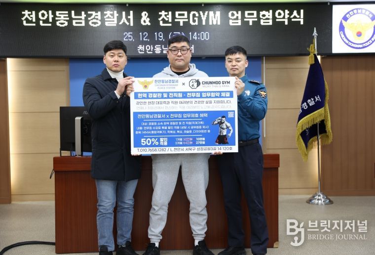 브릿지저널 정보영 기자 | 천안 동남경찰서(서장 송해영)는 2025년 12월 19일(금) 오후 2시, 천안동남경찰서 중회의실에서 무에타이·MMA 전문 체육관인 ‘천무짐’(관장 문보람)과 ‘경찰관 체력 증진 및 복지 향상’을 위한 업무협약(MOU)을 체결했다고 밝혔다.