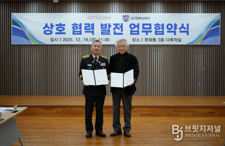 브릿지저널 김진석 기자 | (재)대구광역시동구문화재단(이사장 윤석준)과 대구동부소방서가 지난 12월 19일, 지역 문화시설의 안전관리 강화와 재난 대응 협력 구축을 위한 업무협약(MOU)을 체결했다.
