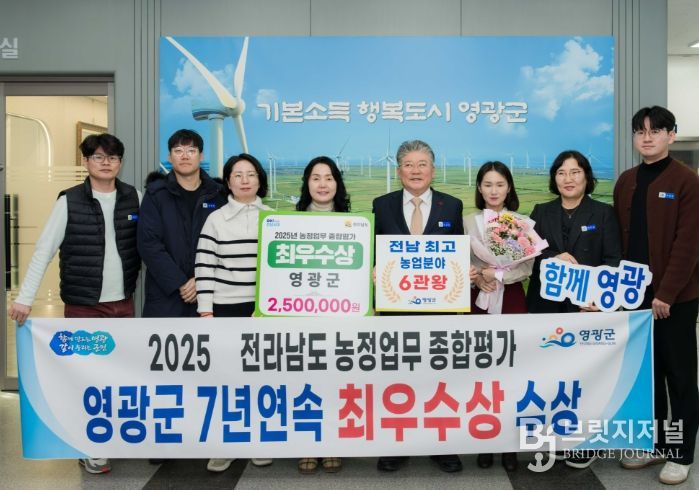 브릿지저널 김경미 기자 | 영광군은 전라남도 2025년 농정업무 종합평가에서 7년 연속 최우수상을 수상하며, 농정 전반에서의 균형 있는 성과로 도내 최고 수준의 농정 역량을 다시 한번 입증했다.