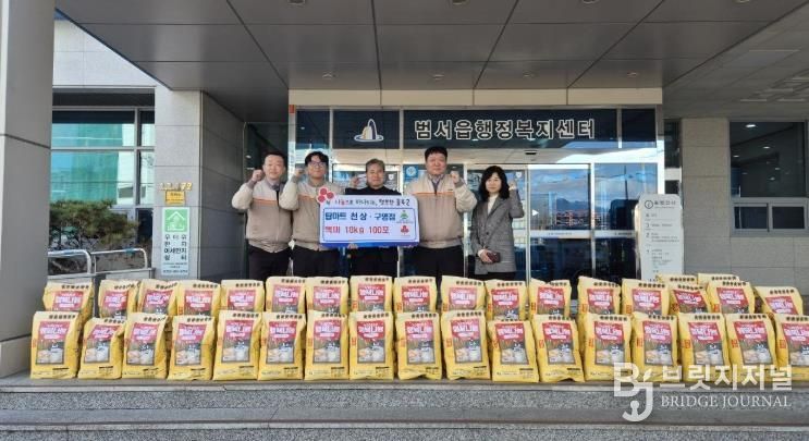 브릿지저널 윤나영 기자 | 탑마트 구영점과 천상점이 22일 울주군 범서읍 행정복지센터에 지역 취약계층을 돕기 위한 백미(10㎏) 50포씩 총 100포를 전달했다.