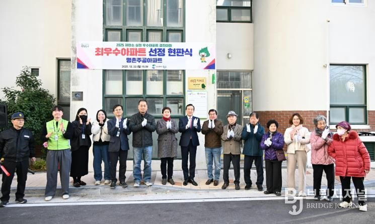 브릿지저널 윤나영 기자 | 울산 북구는 22일 2025년 저탄소 실천 우수아파트 경진대회에서 최우수아파트로 선정된 명촌주공아파트에서 현판식을 열었다.