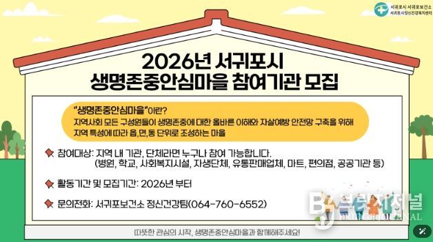 브릿지저널 정보영 기자 | 서귀포보건소는 2026년 생명존중안심마을에 새롭게 함께할 참여기관을 모집한다고 밝혔다. 생명존중안심마을은 마을별 생명존중 네트워크를 형성하는 핵심 사업으로, 보건의료․교육․사회복지․지역사회․공공기관의 5가지 영역별 참여기관이 함께하며 마을 내 생명존중 문화 조성을 위해 협력하는 사업이다.