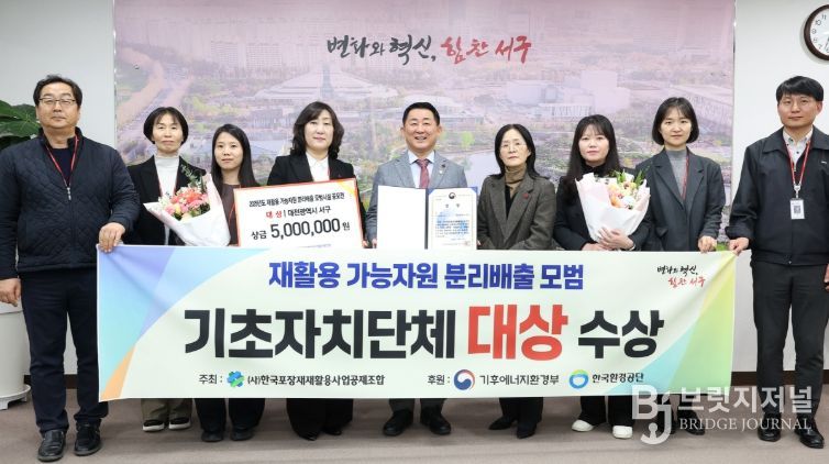 브릿지저널 정보영 기자 | 대전 서구는 22일 ‘2025년 재활용 가능 자원 분리배출 모범시설 공모전’ 기초자치단체 부문에서 대전 자치구 최초로 대상(기후에너지환경부 장관상)을 받았다.