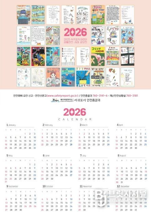 브릿지저널 정보영 기자 | 서귀포시는 지역사회에 생활 속 안전의식 확산을 위해 2025 어린이 생활안전사례 공모전 수상작 30작품을 활용한 안전문화달력 1,500부를 제작하여 전 부서와 학교, 유관기관에 배부했다고 밝혔다.